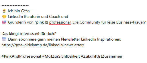 Dein Angebot im Profilslogan nennen. Ich empfehle dir, dein Angebot möglichst an den Anfang zu setzen. So sieht man dein Angebot auch sehr gut, wenn du einen Kommentar schreibst. "Man" sind in diesem Fall auch Leserinnen außerhalb deines eigentlichen Netzwerks, die du durch deine Kommentare erreichst.